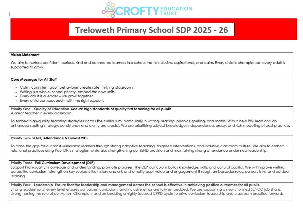 Key Priorities The Key Priorities for our school this year are: You can download a Pdf copy here: Treloweth SDP 25 26 with Trust obj